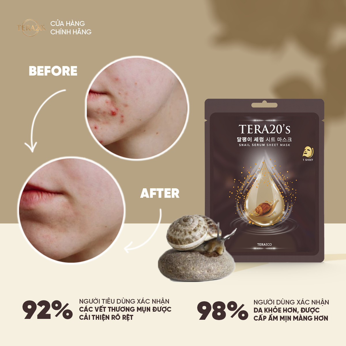 Phương pháp làm đẹp từ Ốc Sên đã được nhắc đến từ những năm 9x. Công nghệ trích xuất tiên tiến từ phòng lab TERAECO với chiết xuất dịch nhầy ốc sên 1,000 PPM giúp khóa ẩm và tái tạo làn da, kiểm soát dầu – nước trên da tốt. Mặt Nạ Tinh Chất Ốc Sên TERA20’s 28ml mang lại cảm giác mềm mịn và không gây bết dính.